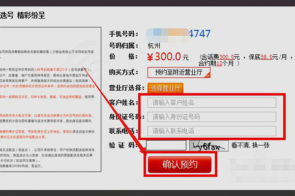 6、点击【预约】按钮后,输入预订人的身份信息,点击确认【预订预约】。然后就可以去附近的营业厅取选好的号码。请参考下图进行操作:
